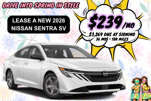 VIN: 3N1AB9CV1TY241072 Stock: N26371 [Model Shown Priced Higher]. Well-qualified lessees lease a new 2026 Sentra SV with Floor Mat Package and Splash Guards (4-piece set) in dealer stock for $239 per month for 36 months. Initial payment excludes taxes, title, and license (TTL). $3,269 due at lease signing (includes: $3,030 down payment, $239 first month payment). Monthly payment includes: $300 manufacturer's rebate, and $500 NMAC Bonus Cash. Offer valid only when financed through NMAC. Subject to residency restrictions. $25,155 MSRP. Net capitalized cost of $21,520. Does not include $695 aquisition fee. Dealer contribution may affect actual price set by dealer. Monthly payments total $8,604 at lease end, purchase for $16,854, plus purchase option fee up to $300 (except KS & WI), plus tax, or pay excess wear & use plus $0.25 per mile for mileage over 10,000 miles per year. Disposition fee due at lease end. No security deposit required. Must take delivery from new dealer stock. Contact participating dealer for details. Lease Offer Ends 05/04/2026. The NMAC SignatureFLEX Lease Program is available on any Nissan model year 2020 or newer from new dealer stock leased through Nissan Motor Acceptance Company (NMAC) with an original or adjusted lease maturity date of 2/1/2025 or later. After lease signing, Program Lessee can purchase additional mileage at $0.10 per mile through the NMAC customer portal or mobile app up to 30 days before Program Lessee’s lease maturity date provided Program Lessee’s account is current and in good financial standing as solely determined by NMAC. Purchase of additional mileage is subject to sales tax. No refund or credit on unused miles. At lease end, pay excess wear & use plus $0.15 per mile (for mileage over the original lease agreement of 15,000 miles per year or 12,000 miles per year) or $0.25 per mile (for mileage over the original lease agreement of 10,000 miles per year or 5,000 miles per year). Contact participating dealer for details. Offer is subject to change at any time and/or is subject to termination without notice. Lease Offer Ends 05/04/2026.
