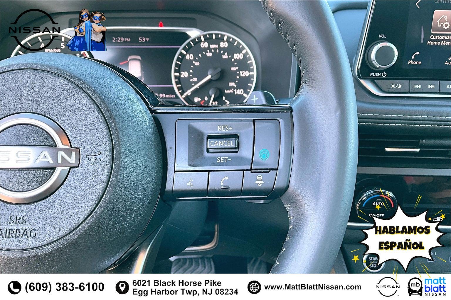 Step inside the Rogue SV and be greeted by a well-appointed, comfortable cabin that caters to your every need. The PRIMATEX Leatherette Seat Trim, Heated Seats, and Heated Leather Wrapped Steering Wheel ensure you and your passengers ride in pure luxury. The Panoramic Moonroof floods the interior with natural light, creating an open and airy atmosphere. Seamless smartphone integration through NissanConnect with Apple CarPlay and Android Auto keeps you connected and entertained on the go.
